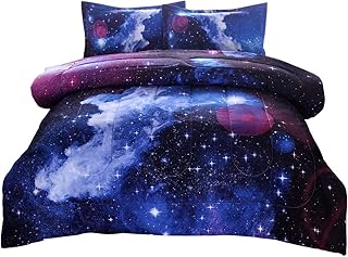 JQinHome フル3ピースギャラクシー掛け布団セット - 3D宇宙テーマ - オールシーズン人工羽毛キルト掛け布団 - リバーシブルデザイン - 掛け布団1枚、枕カバー2枚 (ダークブルー)