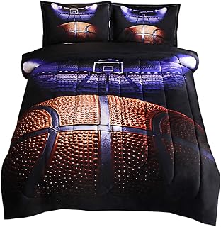 JQinHome フルバスケットボールコート掛け布団セット - 3Dスポーツテーマ - オールシーズン人工羽毛キルト掛け布団 - リバーシブルデザイン - 掛け布団1枚、枕カバー2枚付き