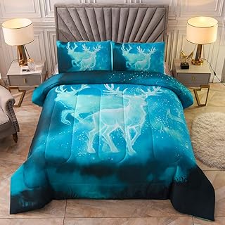 JQinHome クイーンヘラジカ掛け布団3点セット – ファンタジーテーマ – オールシーズンダウン代替キルト掛け布団 – エルクカートゥーンキャラクター – 掛け布団1枚、枕カバー2枚 (ブルードリーム)