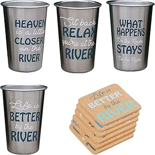 ステンレススチール ドリンクグラス River Life Sayings グラスウェアセット ドリンクコースターセット Life Is Better By The River, Whatever Happens At The River Stays The River