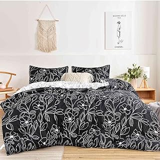 NANKO クイーン掛け布団セット 3点セット ボーホー ホワイト&ブラック 花柄 リーフ柄 リバーシブル オールシーズン 人工羽毛 キルト羽毛布団インサート マイクロファイバー 豪華な寝具セット 90インチ フラワー