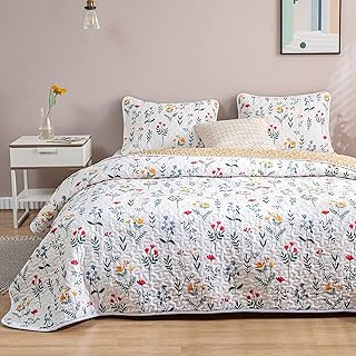 フラワーキルトセット オフホワイトフローラルベッドスプレッド 軽量 花柄とドット リバーシブル ベッドカバー 植物植物 花 寝具セット オールシーズン 1 キルト 枕カバー2枚 (ツイン、ホワイト)