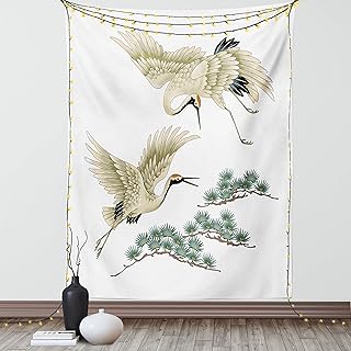 Lunarable バードタペストリー ツインサイズ 日本の鶴2つ 飛ぶ伝統的な絵画スタイル 遠東のイラスト 壁掛け ベッドスプレッド ベッドカバー 壁装飾 68インチ x 88インチ アイボリー グリーン ブラック