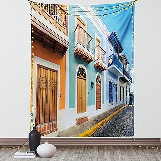 Ambesonne プエルトリコタペストリー ツインサイズ オールドサンファン街 カラフルな家 シーカリビアン建築 壁掛けベッドスプレッド ベッドカバー 壁装飾 68インチ x 88インチ マルチカラー
