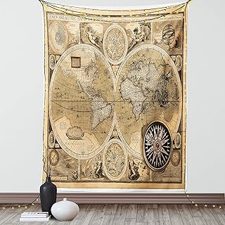 Ambesonne Wanderlust タペストリー ツインサイズ 古い地図 1626 世界歴史的な原稿 壁掛けベッドスプレッド ベッドカバー 壁装飾 68インチ x 88インチ ブラウン ブラック ペールブラウン