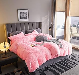 BEDCHOICE ライトピンクキング フラシ天 シャギー 掛け布団カバー3点セット 高級 ウルトラソフト クリスタル ベルベット 寝具セット (フェイクファー掛け布団カバー1枚 + フェイクファー枕カバー2枚) ファスナー開閉