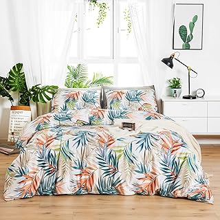 YuHeGuoJi 掛け布団カバー3点セット 綿100% クイーンサイズ トロピカルリーフ寝具セット バーントオレンジ グリーン ボタニカルプリント 掛け布団カバー ジッパー付き 枕カバー2枚 ホテル品質 ソフト 通気性 耐久性