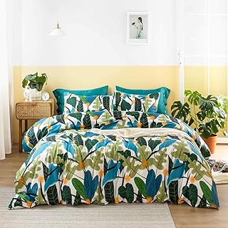 SUSYBAO 掛け布団カバー3点セット コットン100% クイーンサイズ グリーン 植物プリント 寝具セット 熱帯の木の葉 掛け布団カバー1枚 ジッパータイ付き 枕カバー2枚 高級品質 ソフト 通気性 耐久性