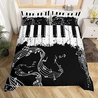 Erosebridal ピアノキー 掛け布団カバー 回転音符 掛け布団カバー 絞り染め 寝具セット 子供 男の子 女の子 レトロ 音楽テーマ 寝具 寝室 装飾 枕カバー2枚付き クイーンサイズ ブラック ホワイト