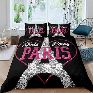 Erosebridal キッズ エッフェル塔 掛け布団カバー クイーンサイズ ピンク ラブハート 寝具セット パリ シティ ビルディング 掛け布団カバー 男の子 女の子 子供 ティーン フランス アーバン ベッドカバー リビングルーム