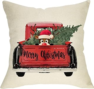 Softxpp メリークリスマス レッド トラック スロー 枕カバー クリスマス ツリー 鹿 装飾 クッション ケース 冬 ホリデー アウトドア デコレーション ファームハウス 枕カバー 装飾サイン ホームカウチ用 18 x 18インチ コットンリネン