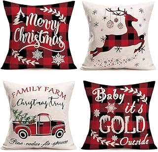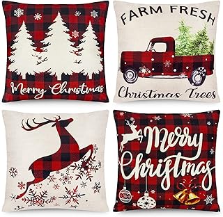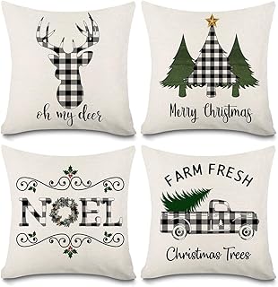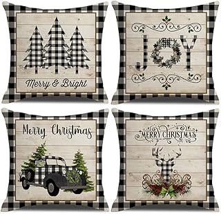 KACOPOL クリスマス バッファロー 格子柄 鹿 クリスマスツリー ファームハウス トラック ノエル 枕カバー コットン リネン スロー 枕カバー クッションカバー 18インチ x 18インチ 4点セット クリスマスデコレーション 18 X 18 Inches