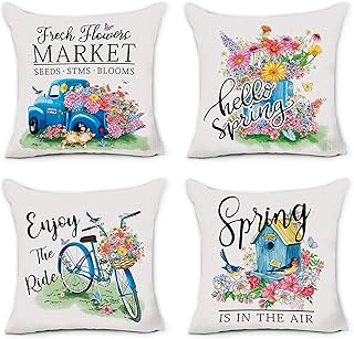 六角形スプリング枕カバー 18 x 18インチ 4枚セット ファームハウス 装飾 フレッシュフラワー ブルートラック コットンリネン スロー 枕カバー リビングルーム カウチ 寝具 ポーチ アウトドア 春 夏 ホームデコレーション