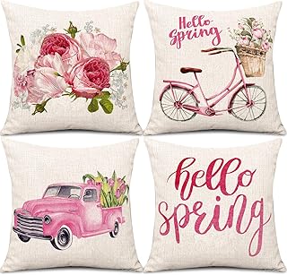 Whaline スプリングスロー枕カバー ピンク ハローキティ 春 枕カバー トラック 自転車 フラワーリネン クッションカバー 18 x 18インチ 4枚セット ファームハウス 花柄 ホームソファ ベッド カウチ用