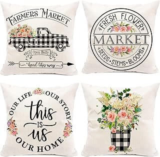 Wtisan ファームハウス 枕カバー ビンテージ トラック フレッシュフラワー コットンリネン スロー 枕カバー 水彩 自転車 フローラル ファームハウス 引用 クッションカバー 18インチ x 18インチ 4個セット 18''X18'' WOW-PILLOW4P-FARM2